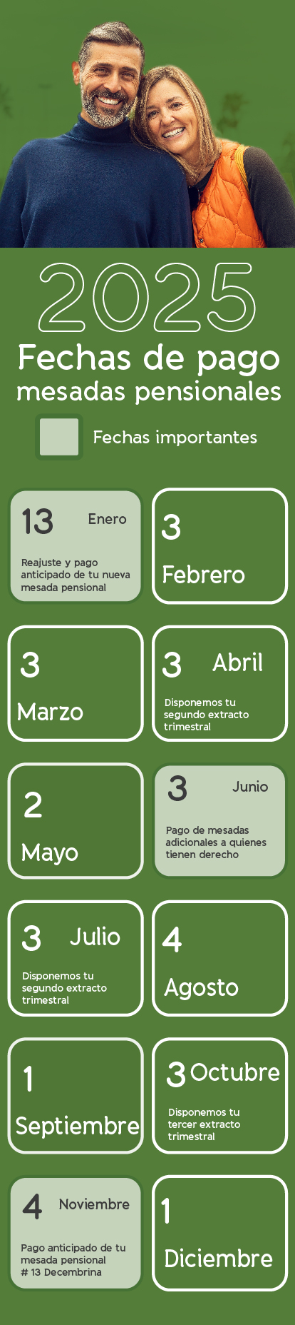 • El 13 de enero: mesada con ajuste del incremento IPC (Índice de Precios al Consumidor)