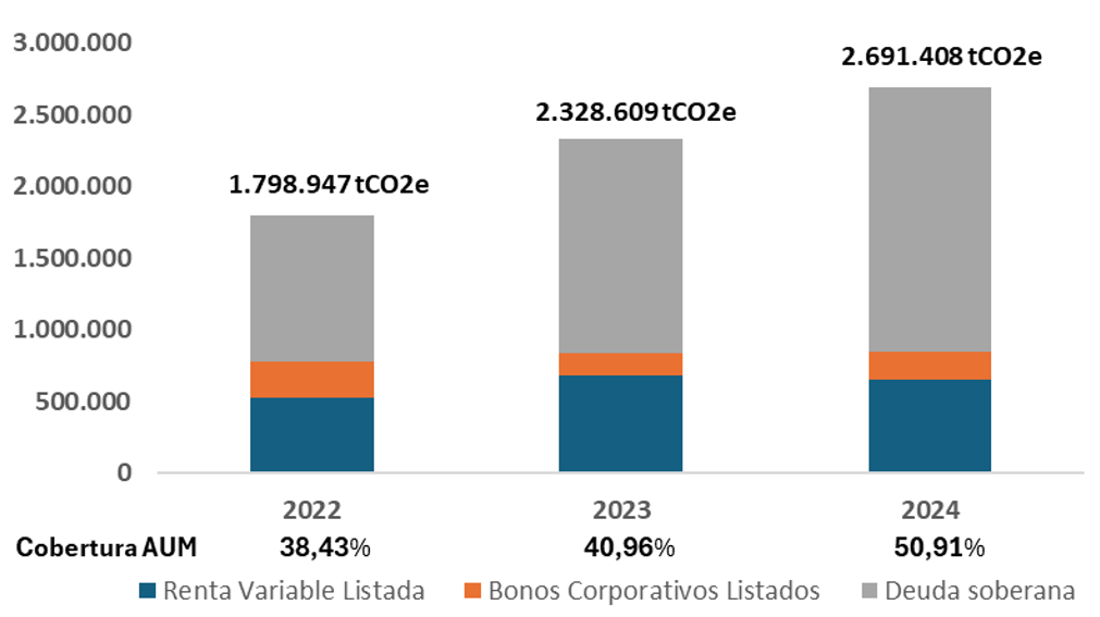 En 2024, las emisiones financiadas y la huella de carbono asociada a los activos de Porvenir, incluyendo renta variable listada, bonos corporativos y bonos soberanos, fueron de 2.691.408 toneladas de CO2e. Asimismo, la huella de carbono para 2024 fue de 105,5 toneladas de CO2e por cada millón de dólares en activos bajo nuestra administración.