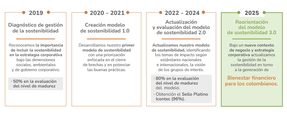 Hemos trabajado de manera continua para fortalecer y evolucionar nuestro modelo de sostenibilidad, adaptándolo a las demandas y realidades del contexto global y local, con un enfoque en la gestión de impactos y la medición efectiva de nuestros avances.