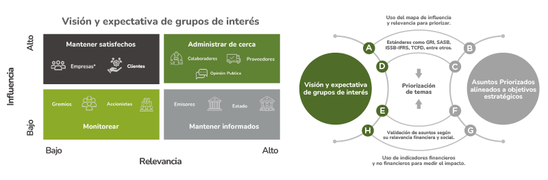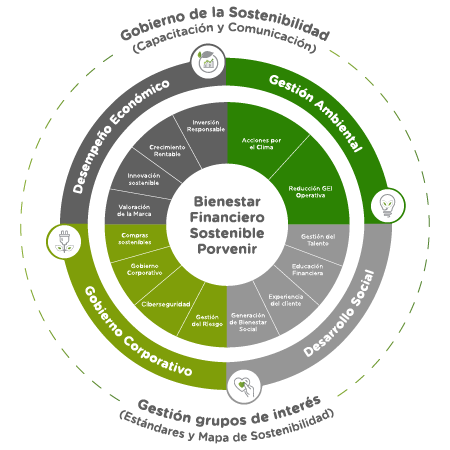 A partir del análisis de materialidad, se constituye el modelo de sostenibilidad de la compañía. Este modelo clasifica los temas priorizados según las siguientes dimensiones de actuación: